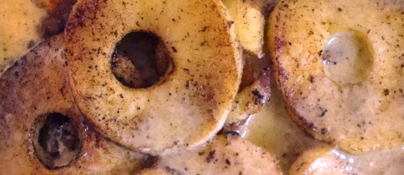 Æblerne skrælles. Kærnehuset udstikkes og æblet skæres i tykke skiver. Hvis du ikke har en udstikker, så skær den blot i både.